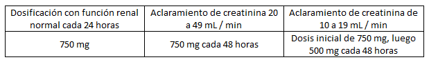 Para los pacientes con aclaramiento de creatinina <50 mL/min, ajustes en el régimen de dosificación son requeridos como se muestra a continuación: