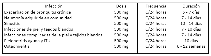 La dosis de Levofloxacina es de 750, 500 o 250 mg por vía oral cada 24 horas, según el siguiente esquema de dosificación: